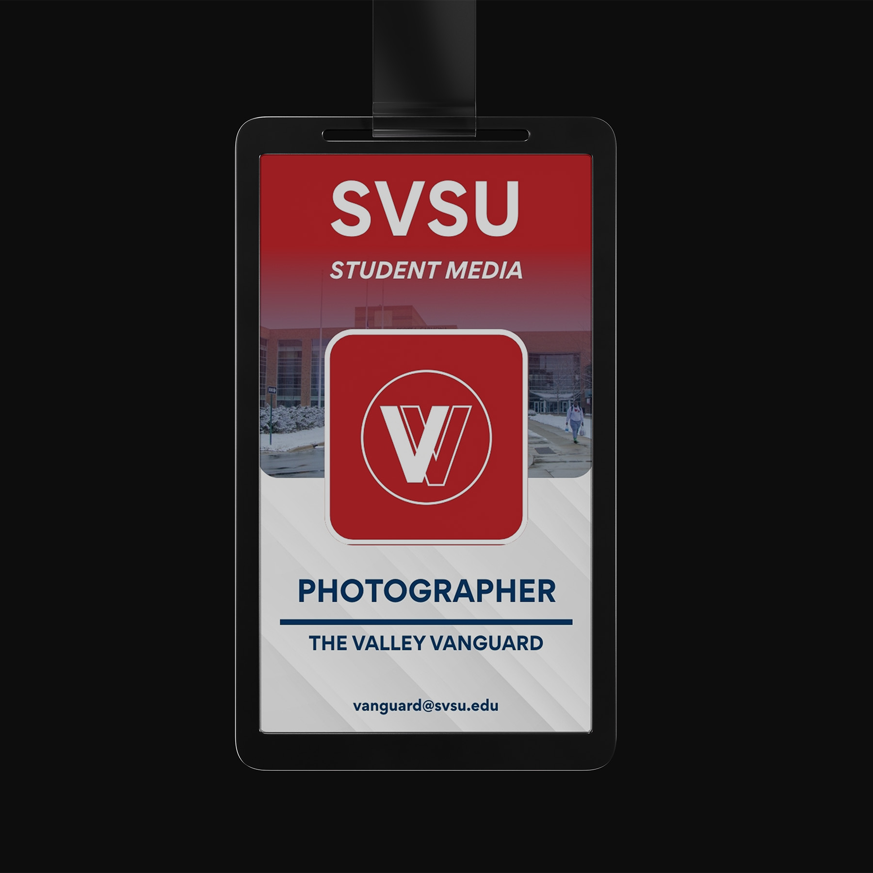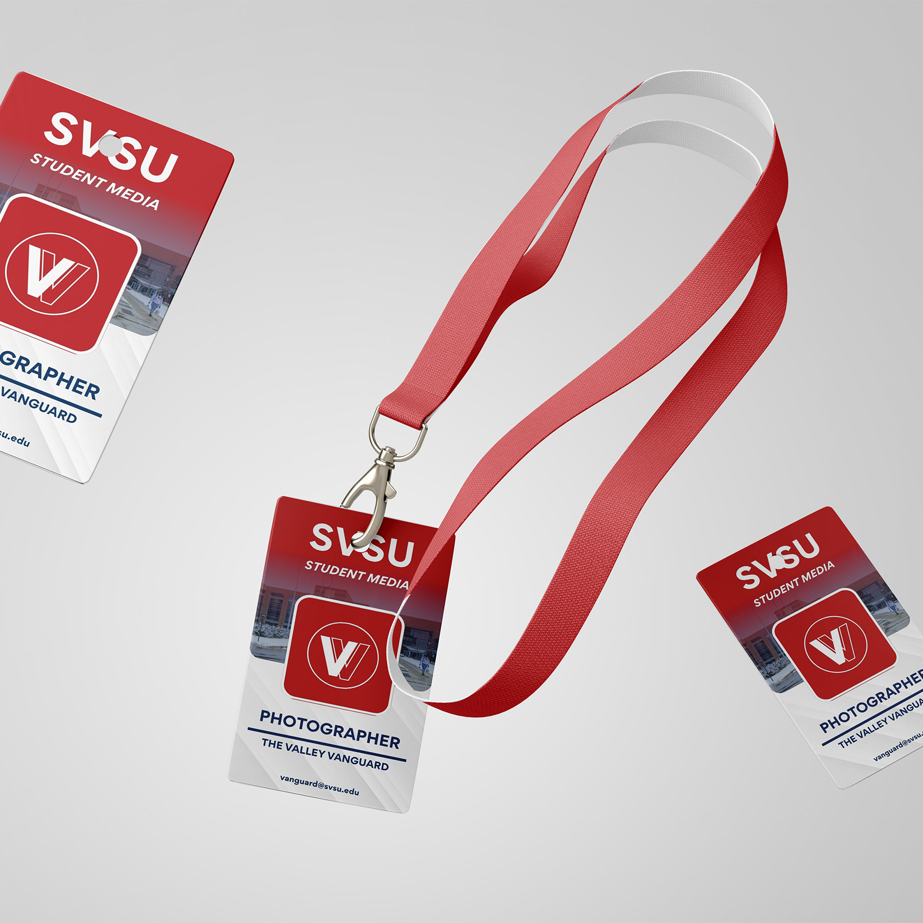 I designed ID badges for photographers and reporters working with the Valley Vanguard to use during on-site coverage at events. The badges were created to clearly identify staff members, helping them gain access while maintaining a professional appearance. The layout prioritizes clarity and quick recognition, featuring the publication’s logo, strong color contrast, and clearly organized information. The use of bold red tones ensures high visibility, while a clean structure keeps the design easy to read at a glance.